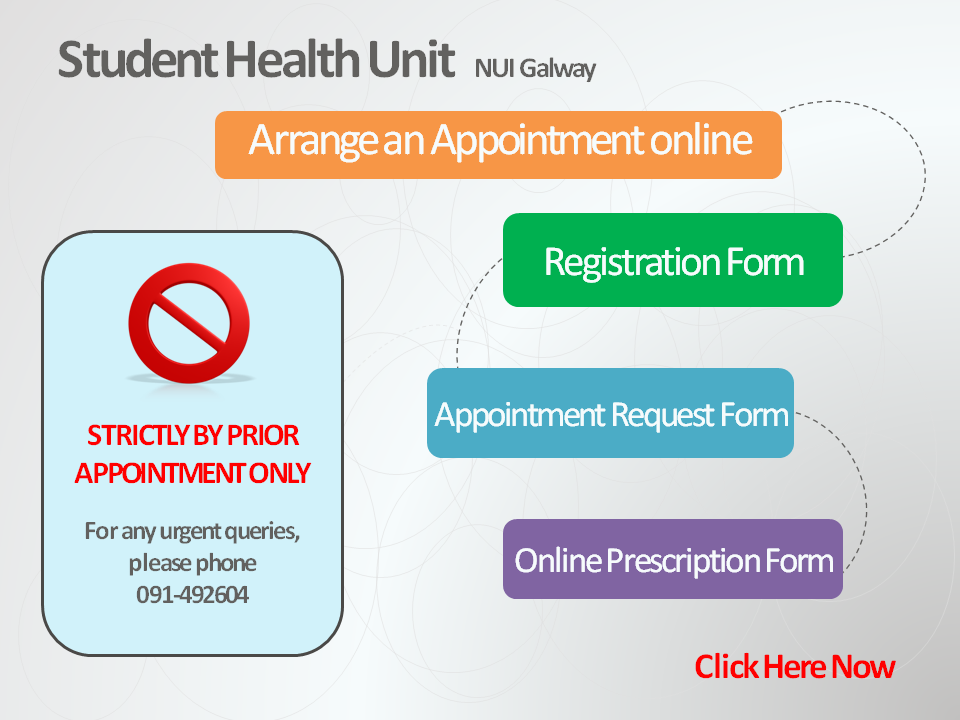 Dá bhrí sin, go ceann i bhfad, is ar bhunús docht ‘RÉAMHCHOINNE AMHÁIN’ a bheidh Aonad Sláinte na Mac Léinn ag feidhmiú lena chinntiú go gcuirtear na bearta is fearr is féidir i bhfeidhm maidir le hionfhabhtú a chosc agus a rialú an t-am ar fad. Ní mór do mhic léinn a bheith cláraithe don bhliain acadúil reatha d’fhonn leas a bhaint as an tseirbhís seo. NÍL CEAD AG MIC LÉINN TEACHT CHUIG AONAD SLÁINTE NA MAC LÉINN GAN TEAGMHÁIL A BHEITH DÉANTA ACU LEIS AN AONAD ROIMH RÉ.